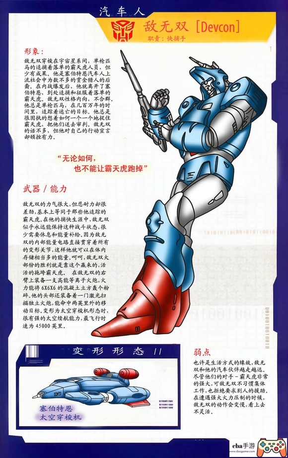 敌无双的飞行速度可以排在全部变形金刚中的第二位,时速达到了45000英里,变形载具形态是一艘太空飞船。